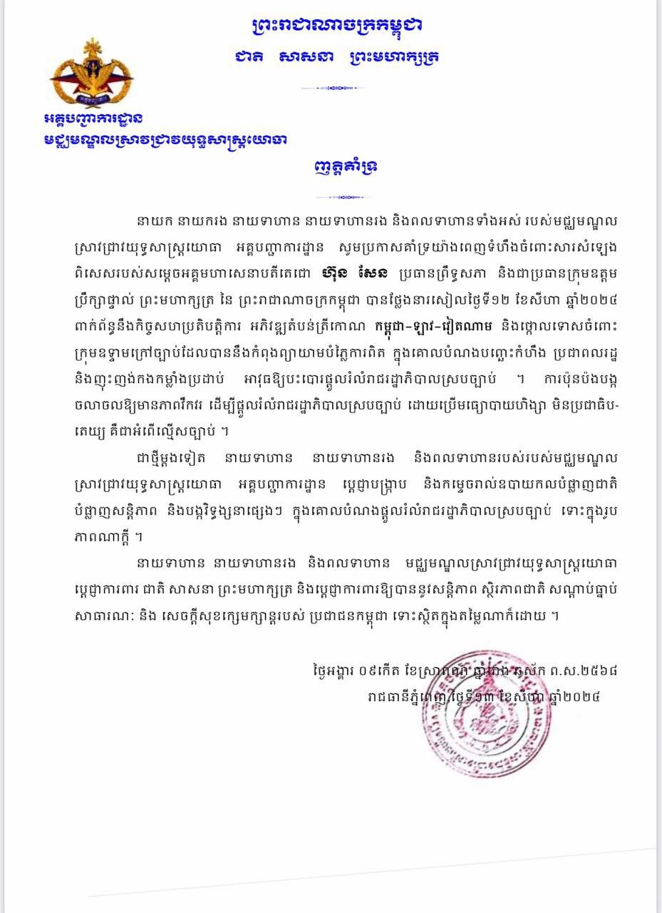 (ភ្នំពេញ)៖ ឧត្តមសេនីយ៍ឯក គឹម វណ្ណា នាយក មជ្ឈមណ្ឌលស្រាវជ្រាវយុទ្ធសាស្ត្រយោធា អគ្គបញ្ជាការដ្ឋាន ព្រមទាំងនាយទាហាន នាយទាហានរង និងពលទាហានទាំងអស់ចំណុះ មជ្ឈមណ្ឌលស្រាវជ្រាវយុទ្ធសាស្ត្រយោធា អគ្គបញ្ជាការ សូមប្រកាសគាំទ្រយ៉ាងពេញទំហឹងចំពោះសារសំឡេងពិសេសរបស់ សម្តេចអគ្គមហាសេនាបតីតេជោ ហ៊ុន សែន ប្រធានព្រឹទ្ធសភា និងជាប្រធានក្រុមឧត្តមប្រឹក្សាផ្ទាល់ ព្រះមហាក្សត្រនៃព្រះរាជាណាចក្រកម្ពុជា បានថ្លែងនារសៀលថ្ងៃទី១២ ខែសីហា ឆ្នាំ២០២៤ ពាក់ព័ន្ធនឹងកិច្ចសហប្រតិបត្តិការអភិវឌ្ឍតំបន់ត្រីកោណ កម្ពុជា-ឡាវ-វៀតណាម និង ថ្កោលទោសចំពោះក្រុមឧទ្ទាមក្រៅច្បាប់ដែលបាននិងកំពុងព្យាយាមបំភ្លៃការពិត ក្នុងគោលបំណងបញ្ឆេះកំហឹងប្រជាពលរដ្ឋ និងញុះញង់កងកម្លាំងប្រដាប់អាវុធឱ្យបះបោរផ្ដួលរំលំរាជរដ្ឋាភិបាលស្របច្បាប់។