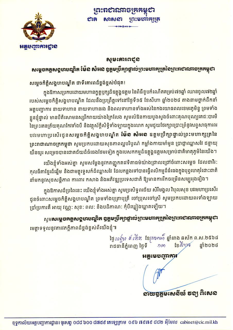 (ភ្នំពេញ)៖ ឯកឧត្ដម នាយឧត្តមសេនីយ៍ វង្ស ពិសេន អគ្គមេបញ្ជាការ កងយោធពលខេមរភូមិន្ទ ព្រមទាំងនាយទាហាន នាយទាហានរង និងពលទាហានទាំងអស់នៃកងយោធពលខេមរភូមិន្ទ ផ្ញើសារជូនពរ សម្ដេចកិត្តិសង្គហបណ្ឌិត ម៉ែន សំអន ឧត្តមប្រឹក្សាផ្ទាល់ព្រះមហាក្សត្រ នៃព្រះរាជាណាចក្រកម្ពុជា ក្នុងឱកាសជ័យមង្គល នៃខួបកំណើតរបស់សម្តេចកិត្តិសង្គបណ្ឌិត គម្រប់៧១ឆ្នាំ ឈានចូល ៧២ឆ្នាំ។