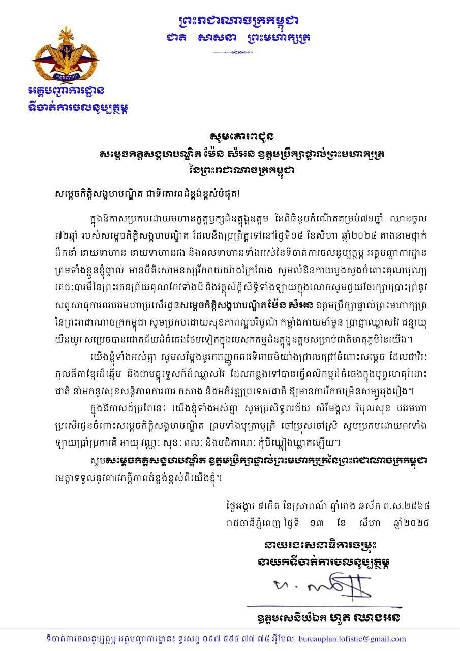 ឧត្ដមសេនីយ៍ឯក ហួត ឈាងអន ផ្ញើសារជូនពរ សម្ដេចកិត្តិសង្គហបណ្ឌិត ម៉ែន សំអន ក្នុងឱកាសជ័យមង្គលនៃខួបកំណើតគម្រប់៧១ឆ្នាំ ឈានចូល ៧២ឆ្នាំ