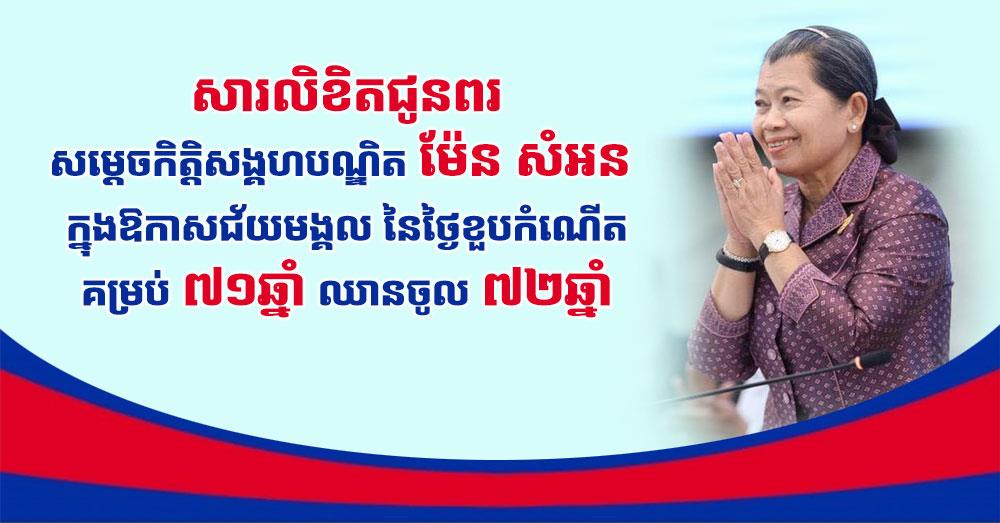 ឆ្លៀតក្នុងឱកាសនេះ យើងខ្ញុំសូមកោតសរសើរ និងវាយតម្លៃខ្ពស់ចំពោះសម្ដេចកិត្តិសង្គហបណ្ឌិត ម៉ែន សំអន ដែលជាថ្នាក់ដឹកនាំស្ត្រីមួយរូបពោរពេញទៅដោយគុណធម៌ និងគំរូវីរភាពដ៏ប្រពៃ ដែលបានយកអស់កម្លាំងកាយចិត្ត ប្រាជ្ញា ស្មារតី ក្នុងការរួមចំណែកដ៏ធំធេងក្នុងបុព្វហេតុបម្រើជាតិ មាតុភូមិ ជាពិសេស តែងតែខិតខំ ប្រឹងប្រែងលើកស្ទួយសិទ្ធិនារី ការពារអត្តសញ្ញាណជាតិ ប្រពៃណី ទំនៀមទម្លាប់ និងវប្បធម៌ជាតិដ៏ល្អផូរផង់ និងបានចូលរួមគ្រប់សកម្មភាពក្នុងទិសដៅបម្រើឧត្តមប្រយោជន៍សុខសន្តិភាព ស្ថិរភាព ភាពចម្រុងចម្រើនន ប្រទេសជាតិ និងសុខុមាលភាពប្រជាជន។