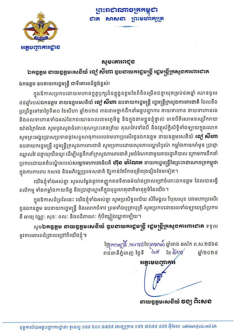 នៅក្នុងឱកាសដ៏មហាមង្គលសួស្តីប្រពៃថ្លៃថ្នានេះ យើងខ្ញុំទាំងអស់គ្នា សូមបួងសួងដល់វត្ថុស័ក្តិសិទ្ធិ ក្នុងលោកតាមជួយបីបាច់ថែរក្សា និងប្រសិទ្ធិពរជ័យសិរីមង្គល មហាប្រសើរជូនចំពោះ ឯកឧត្តម នាយឧត្តមសេនីយ៍ ទៀ សីហា ឧបនាយករដ្ឋមន្ត្រី រដ្ឋមន្ត្រីក្រសួងការពារជាតិ សូមប្រកបដោយសុខភាពល្អបរិបូណ៌កម្លាំងកាយមាំមួន ប្រាជ្ញា ឈ្លាសវៃ ជន្មាយុយឺនយូរ ដើម្បីបន្តដឹកនាំក្រសួងការពារជាតិ រួមចំណែកជាមួយរាជរដ្ឋាភិបាល ក្រោមការដឹកនាំ ប្រកបដោយគតិបណ្ឌិតរបស់សម្ដេចមហាបវរធិបតី ហ៊ុន ម៉ាណែត នាយករដ្ឋមន្រ្តីនៃព្រះរាជាណាចក្រកម្ពុជា ក្នុងការការពារ កសាង និងអភិវឌ្ឍប្រទេសជាតិ ឱ្យកាន់តែរីកចម្រើនរុងរឿងថែមទៀត។