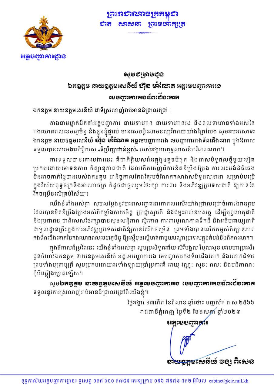 នាឱកាសដ៏វិសេសវិសាលថ្លៃថ្លានេះ សូមបួងសួងដល់គុណបុណ្យព្រះរតនត្រ័យ និងវត្ថុស័ក្តិសិទ្ធិទាំងឡាយ សូមជួយប្រោះព្រំសព្ទសាធុការពរ សិរីសួស្ដី ជ័យមង្គលជូន ឯកឧត្ដម នាយឧត្ដមសេនីយ៍បណ្ឌិត ហ៊ុន ម៉ាណែត និងលោកជំទាវ ព្រមទាំងក្រុមគ្រួសារ សូមមានសុខភាពល្អបរិបូរណ៍ កម្លាំងកាយមាំមួន ប្រាជ្ញាភ្លឺថ្លា មានអាយុយឺនយូរ ឈ្នះអស់មារសត្រូវគ្រប់ទិសទី សម្រេចបានជោគជ័យថ្មីៗថែមទៀត និងសូមបានប្រកបដោយពុទ្ធពរទាំង៤ប្រការគឺ អាយុ វណ្ណៈ សុខៈ ពលៈ កុំបីឃ្លៀងឃ្លាតឡើយ៕