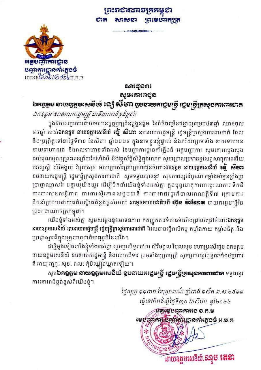 នៅក្នុងឱកាសដ៏មហាមង្គលសួស្តីប្រពៃថ្លៃថ្នានេះ យើងខ្ញុំទាំងអស់គ្នា សូមបួងសួងដល់វត្ថុស័ក្តិសិទ្ធិ ក្នុងលោកតាមជួយបីបាច់ថែរក្សា និងប្រសិទ្ធិពរជ័យសិរីមង្គល មហាប្រសើរជូនចំពោះ ឯកឧត្តម នាយឧត្តមសេនីយ៍ ទៀ សីហា ឧបនាយករដ្ឋមន្ត្រី រដ្ឋមន្ត្រីក្រសួងការពារជាតិ សូមប្រកបដោយសុខភាពល្អបរិបូណ៌កម្លាំងកាយមាំមួន ប្រាជ្ញា ឈ្លាសវៃ ជន្មាយុយឺនយូរ ដើម្បីបន្តដឹកនាំក្រសួងការពារជាតិ រួមចំណែកជាមួយរាជរដ្ឋាភិបាល ក្រោមការដឹកនាំ ប្រកបដោយគតិបណ្ឌិតរបស់សម្ដេចមហាបវរធិបតី ហ៊ុន ម៉ាណែត នាយករដ្ឋមន្រ្តីនៃព្រះរាជាណាចក្រកម្ពុជា ក្នុងការការពារ កសាង និងអភិវឌ្ឍប្រទេសជាតិ ឱ្យកាន់តែរីកចម្រើនរុងរឿងថែមទៀត។